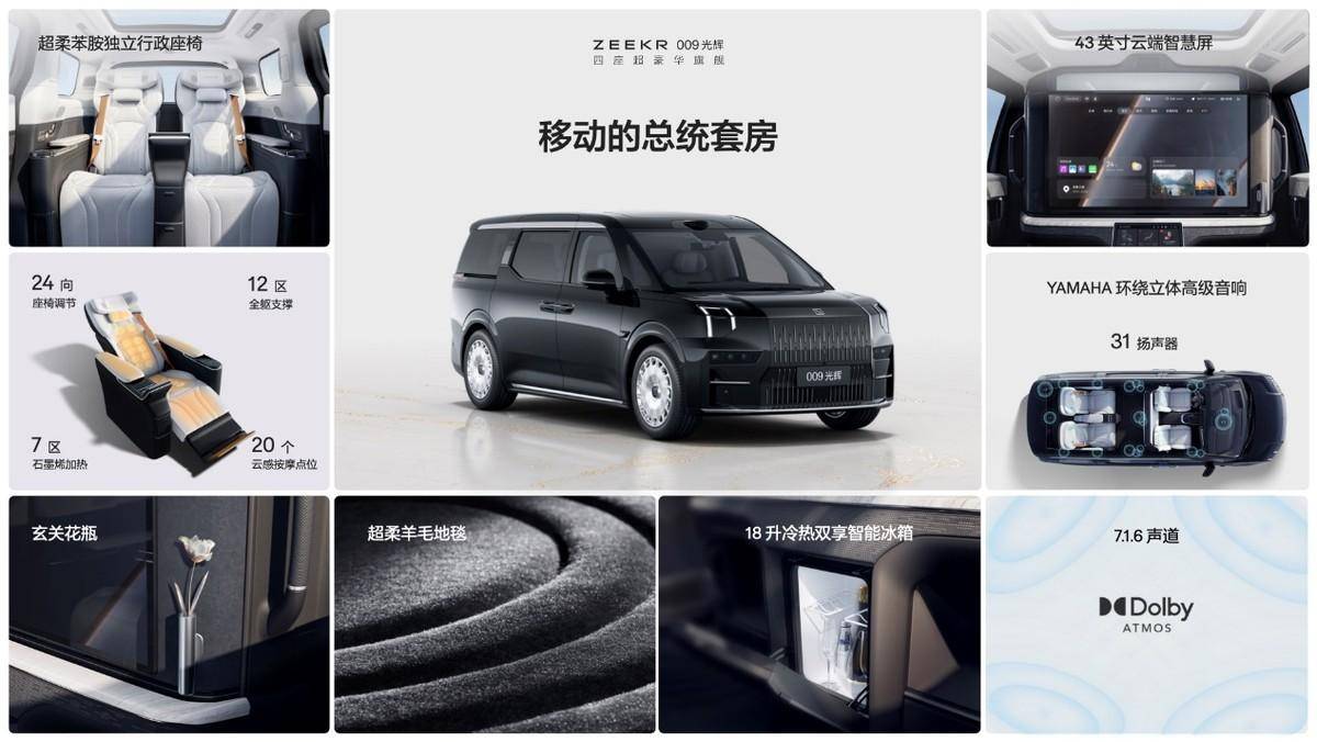發布會上,極氪智能科技CEO 安聰慧回顧了極氪009的傲人成績。作為全球第一款原生純電豪華MPV,極氪009以設計、安全、豪華方面的全新基準,開啟了高端純電MPV的新時代:在不到16個月的時間,累計交付超過22000臺;2023年成為50萬元以上全品類MPV的年度銷量冠軍。極氪009也由此成為智能電動時代,中國品牌打造更頂級豪華產品的實力代表之一。而全新上市的極氪009光輝則以守護生命、穿越時間和創造內心愉悅,帶給用戶前所未有的百萬級超豪華體驗。