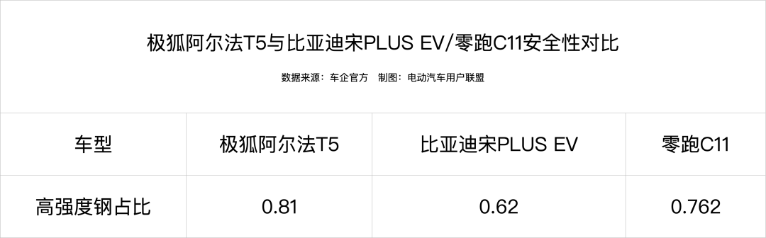 從數據上看,阿爾法T5車身采用81%多的高強度鋼和鋁合金,行業平均值是60%,宋PLUS EV只有62%,零跑C11稍高點,為76.2%,但均比T5要少。