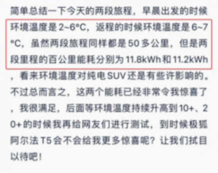 不過,為了給大家一個參考,我們暫且分享另一位極狐阿爾法T5車主的續航情況吧:春節期間,在零下4度的北京,這臺車也能跑出8.8折的續航成績,真是讓人吃驚。
